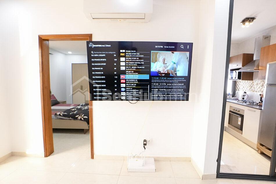 Studio au 7ème étage : 1 chambre + salle d’eau, 1 balcon, 1 salon, 1 cuisine équipée et une toilette visiteurs toutes les pièces sont climatisées et chacune une télévision , chauffe-eau, internet illimité ; service de nettoyage Sécurité 24H/24 Prix journalier : 25.000F Prix mensuels : 750.000F