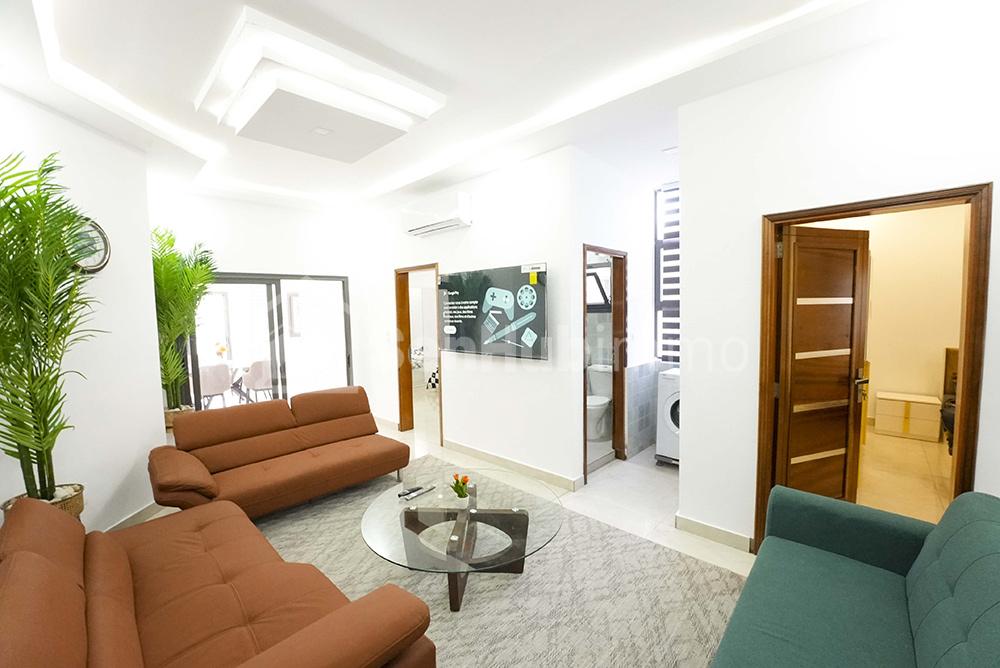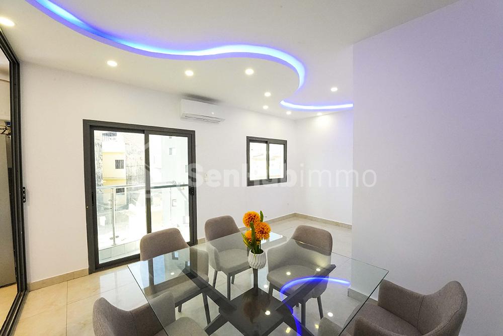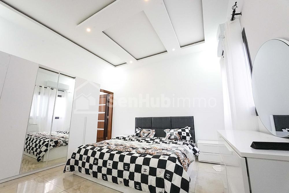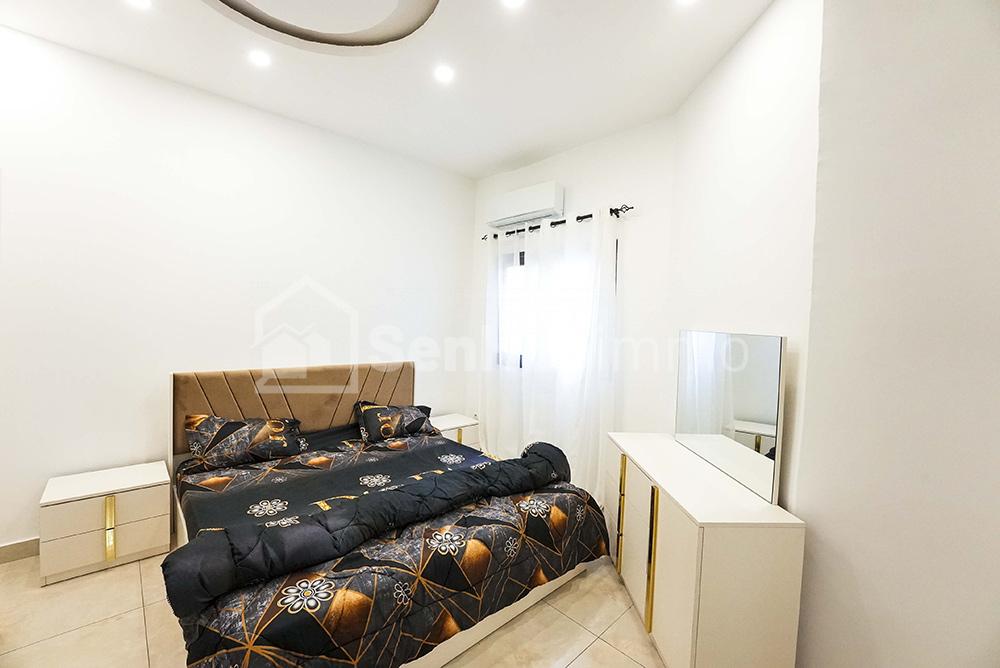 Appartement 2 chambres haut stanting 1 salle d’eau et une toilette visiteur Situé au 2eme étage Journée 40.000f Minimum 3 jours Internet illimité service de nettoyage Iptv Recharge Woyofal à la charge du clien