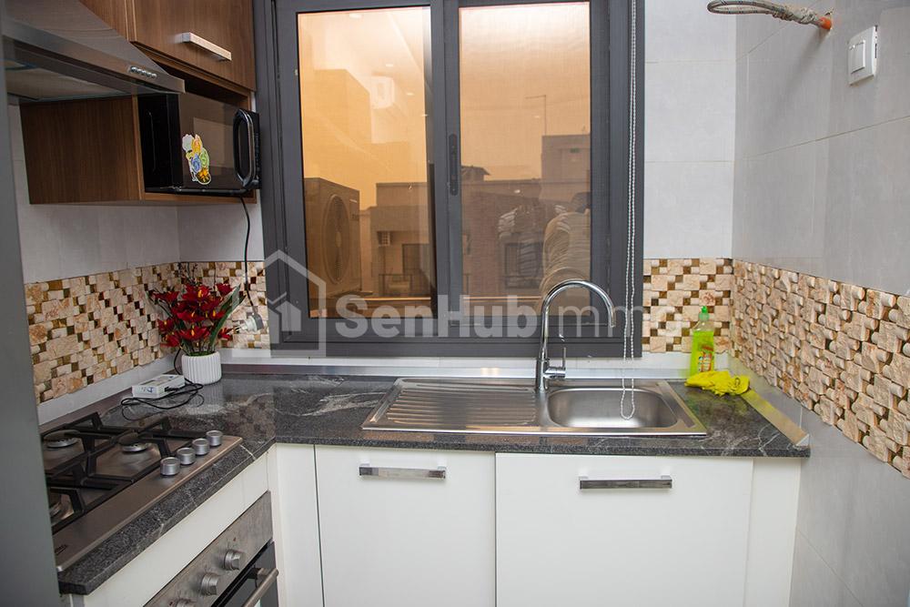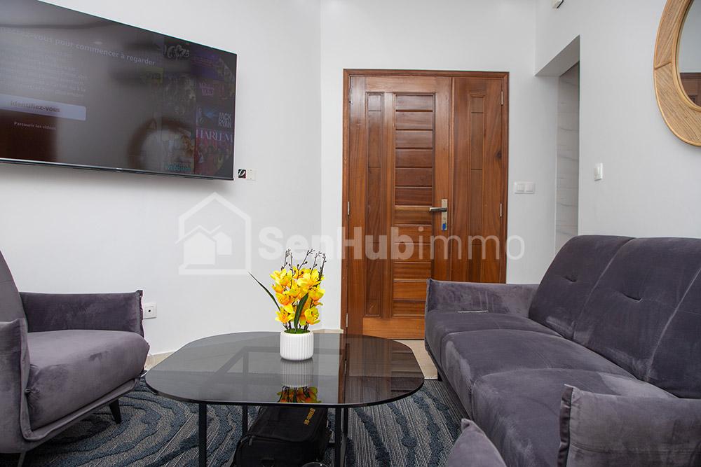 Studio D4 : 90m2 – Max 2 personnes 30.000fr la nuitée à partir de 3 nuits 750.000f location mensuelle Situé au 4eme étage : 1 chambre avec salle d'eau, salon, cuisine équipée, balcon et toilette visiteur Toutes les pièces sont climatisées, chauffe-eau, internet illimité, service de nettoyage un jour sur 2 du lundi au samedi Sécurité 24h/24 et 7j/7