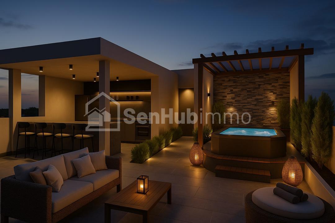 La terrasse en court de finalisation sera accessible aux locataires et leur invités (dans le respect du règlement de vie commune) avec une cuisine un lounge et un espace jaccuzzi.